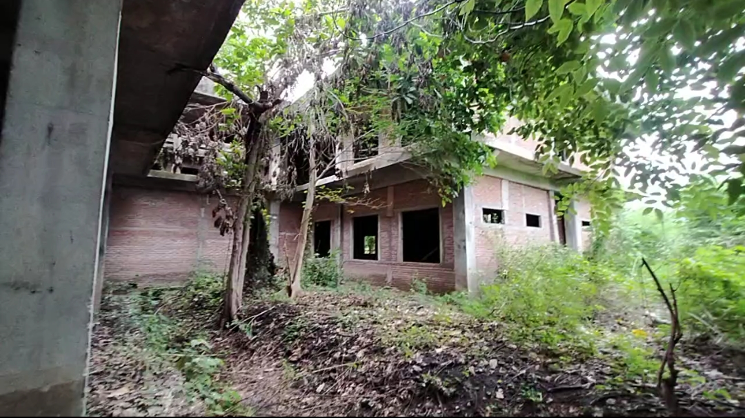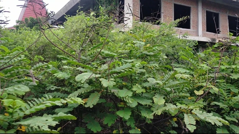 Setelah mengitari gedung mangkrak ini, terlihat ada semak yang bisa dilalui di bagian belakang gedung (sebelah timur, red). Wartawan turun dari mobil dan menerobos semak belukar di salah satu sudut gedung yang dindingnya terbuat dari batu bata merah itu.