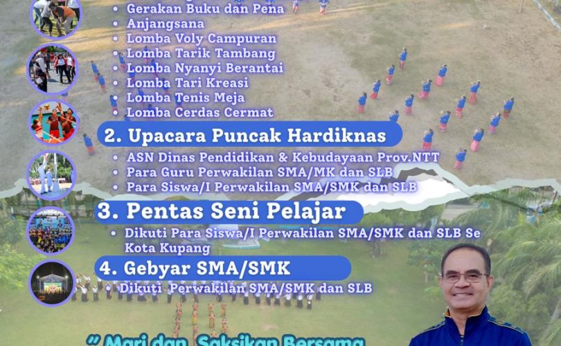 SPIRITNESIA.COM, KUPANG – Dinas Pendidikan dan Kebudayaan (P&K) Provinsi Nusa Tenggara Timur (NTT) menyiapkan rangkaian kegiatan semarak guna memperingati Hari Pendidikan Nasional (Hardiknas) 2026. Mengusung semangat kolaborasi, rangkaian acara ini dijadwalkan berlangsung mulai 10 April hingga puncaknya pada 4 Mei 2026.
